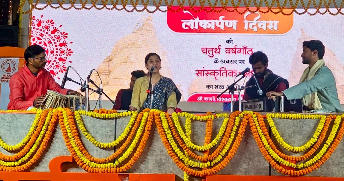 वाराणसी। काशी विश्वनाथ मंदिर के नवीनीकरण के चतुर्थ वर्षगांठ के उपलक्ष्य में शिवार्चनम सांस्कृतिक मंच पर आयोजित सांस्कृतिक संध्या में उदीयमान गायिका विदुषी वर्मा ने भक्तिमय भजन प्रस्तुत किया। विदुषी ने गायन का आरंभ जय शिव शंकर ,जय गंगाधर से किया। तत्पश्चात विनती सुनिए नाथ हमारी गाकर वातावरण को भक्तिरस से सरोबर कर दिया। मंदिर प्रांगण में उपस्थित श्रद्धालुओं ने भी हर हर महादेव का उद्घोष कर विदुषी की भावपूर्ण गायन को सराहा। विदुषी के साथ तबले पर ओम प्रकाश पांडेय, संवादिनी पर प्रवीण सिंह, बांसुरी पर ऋतिक शुक्ला एवं ऑक्टापैड पर विवेक सिंह ने सुमधुर संगति प्रदान किया। कार्यक्रम के अंत में मंदिर के मुख्य कार्यपालक अधिकारी विश्व भूषण मिश्रा ने विदेशी को अंग वस्त्रम एवं रुद्राक्ष की माल देकर आशीर्वचन प्रदान किया। कार्यक्रम का कुशल संचालन कन्हैया दुबे ने किया।