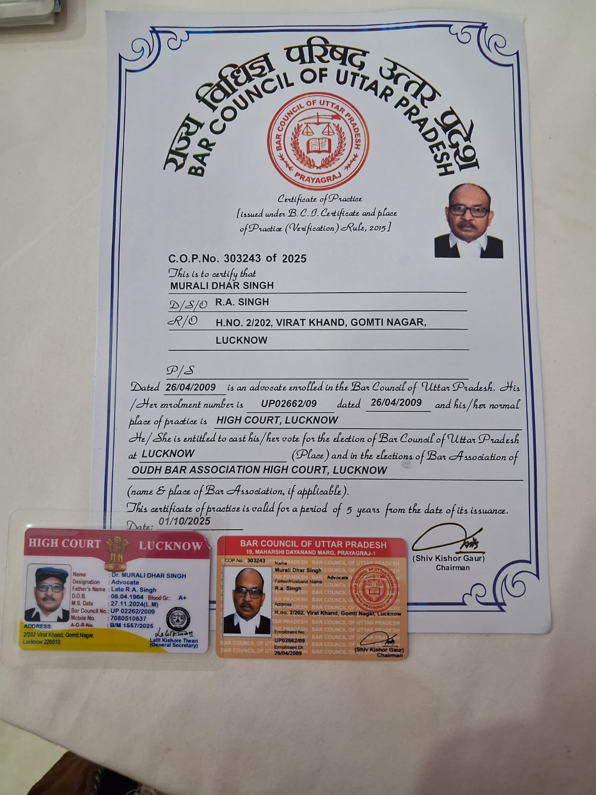 मैं माननीय उच्च न्यायालय के वरिष्ठ अधिवक्ता मा श्रीहर गोविंद सिंह परिहार जी के विशेष कृपा पर तथा अवध बार के पूर्व अध्यक्ष श्री रिपु दमन साही एवं मनोज द्विवेदी जी के विशेष अनुरोध परअवध बार का आजीवन सदस्य बना