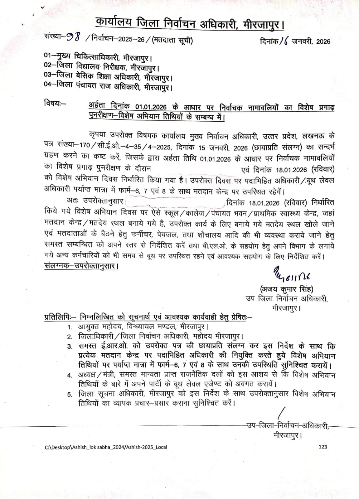 उप जिला निर्वाचन अधिकारी अजय कुमार सिंह ने जानकारी देते हुए बताया है कि मुख्य निर्वाचन अधिकारी, उत्तर प्रदेश, लखनऊ के पत्र दिनांक 15 जनवरी, 2026 द्वारा अर्हता तिथि 01.01.2026 के आधार पर निर्वाचक नामावलियों का विशेष प्रगाढ़ पुनरीक्षण के दौरान एवं दिनांक 18.01.2026 (रविवार) को विशेष अभियान दिवस निर्धारित किया गया है।