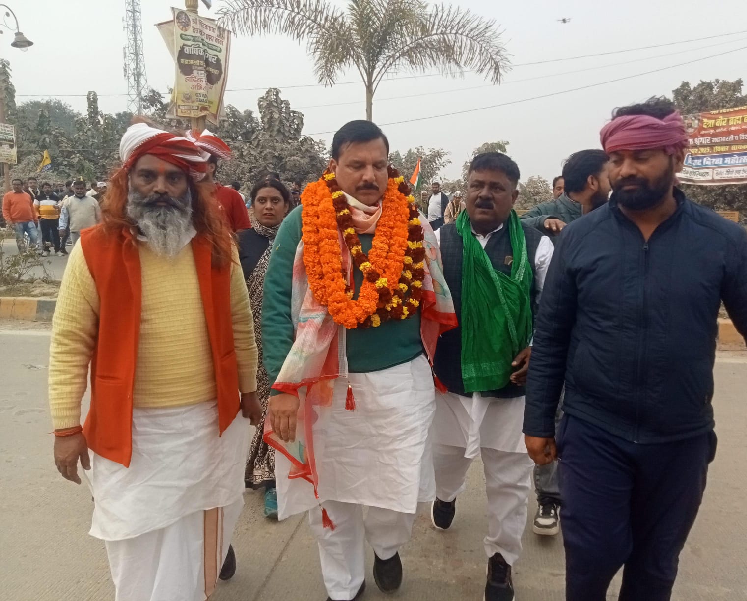 लोहता। चांदपुर भदोही मार्ग पर गोपालपुर कोरौता स्थित सिटकहवा वीर बाबा मंदिर के सामने रोजगार दो सामाजिक न्याय दो पदयात्रा के दौरान आम आदमी पार्टी के यूपी प्रभारी एवं राज्यसभा सांसद संजय सिंह का माला पहना कर जोरदार स्वागत