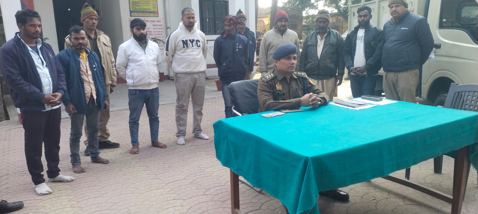 पुलिस टीम द्वारा चेकिंग के दौरान 01 डीसीएम व 03 मैजिक वाहनों में लादकर वध हेतु ले जा रहे 16 राशि गोवंशों (15 गाय व 01 बछड़ा) की बरामदगी करते हुए 07 शातिर गोतस्करों व 01 पासर सहित 08 अभियुक्तों को किया गया गिरफ्तार।