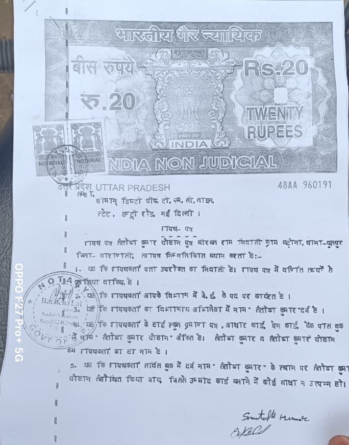 शपथ पत्र संतोष कुमार चौहान पुत्र बीरबल राम निवासी ग्राम बढ़ौना थाना फुलपुर जिला वाराणसी शपथ निम्नलिखित बयान करता है यह की शपथ कर्ता पता उपरोक्त का निवासी है शपथ पत्र में वणिंत तथ्यों से लिया वाक़िफ है यह की शपथ कर्ता आपके विभाग में जे ई के पद पर कार्यरत है