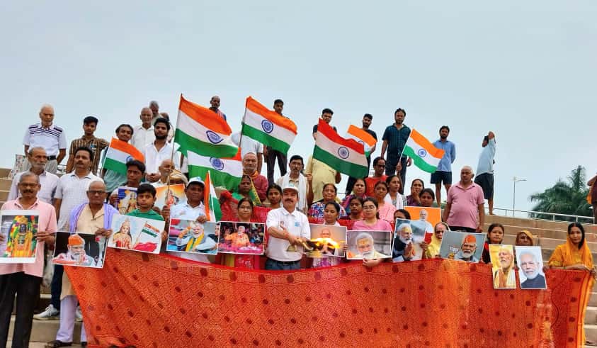 प्रधानमंत्री नरेंद्र मोदी के जन्मदिन पर नमामि गंगे ने उनकी लंबी उम्र के लिए उनकी तस्वीर संग मां गंगा की आरती उतारी। सामने घाट पर पीएम की लंबी उम्र के लिए मां गंगा को 75 मीटर लंबी चुनरी प्रतीकात्मक रूप से चढ़ाई गई । चढ़ाई गई चुनरी को जरूरतमंद महिलाओं में वितरित किया गया । बुधवार को जल शक्ति मंत्रालय राष्ट्रीय स्वच्छ गंगा मिशन द्वारा 17 सितंबर से 2 अक्टूबर तक आहूत ‘स्वच्छता पखवाड़ा’ के तहत एक ओर गंगा तट की सफाई की गई तो दूसरी ओर मां गंगा का दुग्धाभिषेक कर पूजन-अर्चन किया गया। नमामि गंगे के सदस्यों ने उपस्थित जनसमूह के साथ राष्ट्रध्वज तिरंगा लेकर पीएम मोदी और केंद्र सरकार के लिए मां गंगा से आशीर्वाद मांगा।