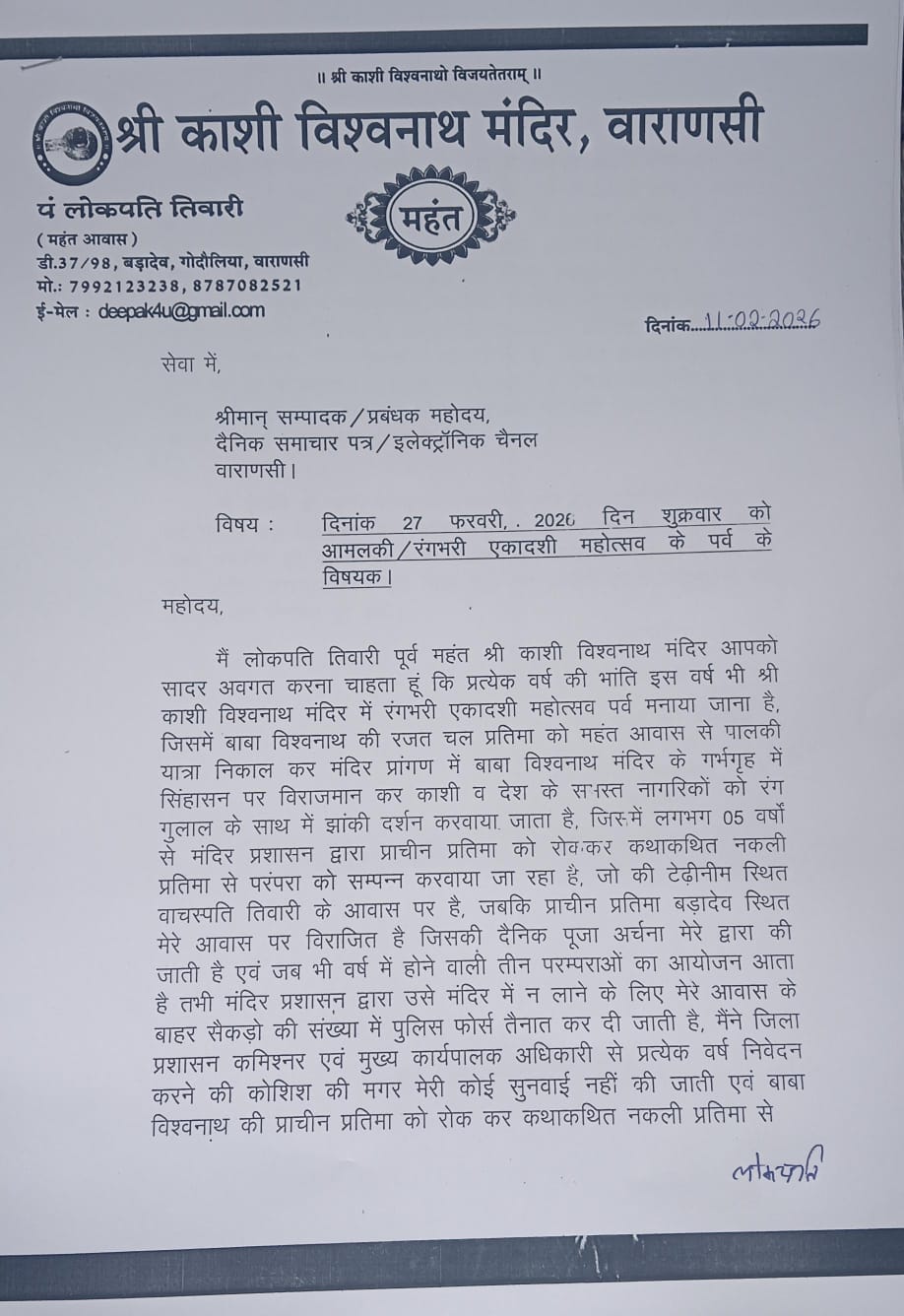 मैंने जिला प्रशासन कमिश्नर एवं मुख्य कार्यपालक अधिकारी से प्रत्येक वर्ष निवेदन करने की कोशिश की मगर मेरी कोई सुनवाई नहीं की जाती एवं बाबा विश्वनाथ की प्राचीन प्रतिमा को रोक कर कथाकथित नकली प्रतिमा से परम्पराओं को सम्पन्न करवाया जा रहा है।