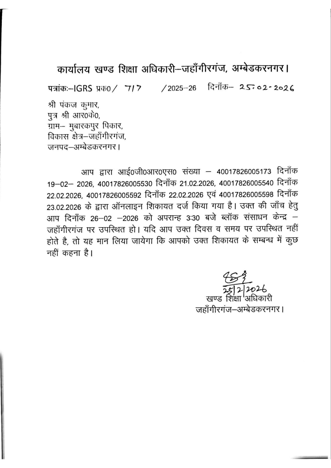 अम्बेडकर नगर जिले के शिक्षाक्षेत्र जहाँगीरगंज में तैनात खंड शिक्षा अधिकारी संतोष पांडेय पर गंभीर आरोप लगे हैं कि वे अपने ही खिलाफ दर्ज शिकायतों की जांच स्वयं कर फर्जी और मनगढ़ंत तरीके से निस्तारण कर रहे हैं। शिकायतकर्ता द्वारा आईजीआरएस पोर्टल पर फरवरी 2026 में दर्ज कई शिकायतों के बावजूद जांच का जिम्मा फिर उसी अधिकारी को सौंप दिया गया, जिन पर आरोप हैं।