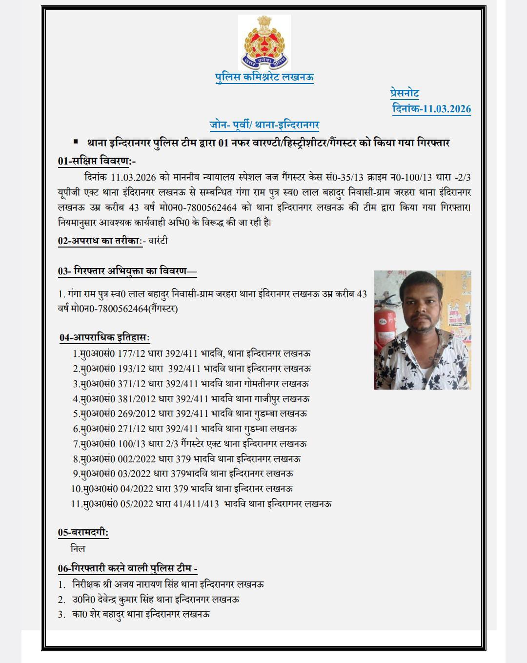 थाना इंदिरा नगर निरीक्षक अजय नारायण सिंह की सूझबूझ से वारंटी हिस्ट्रीशीटर गंगाराम भेजा गया हवालात