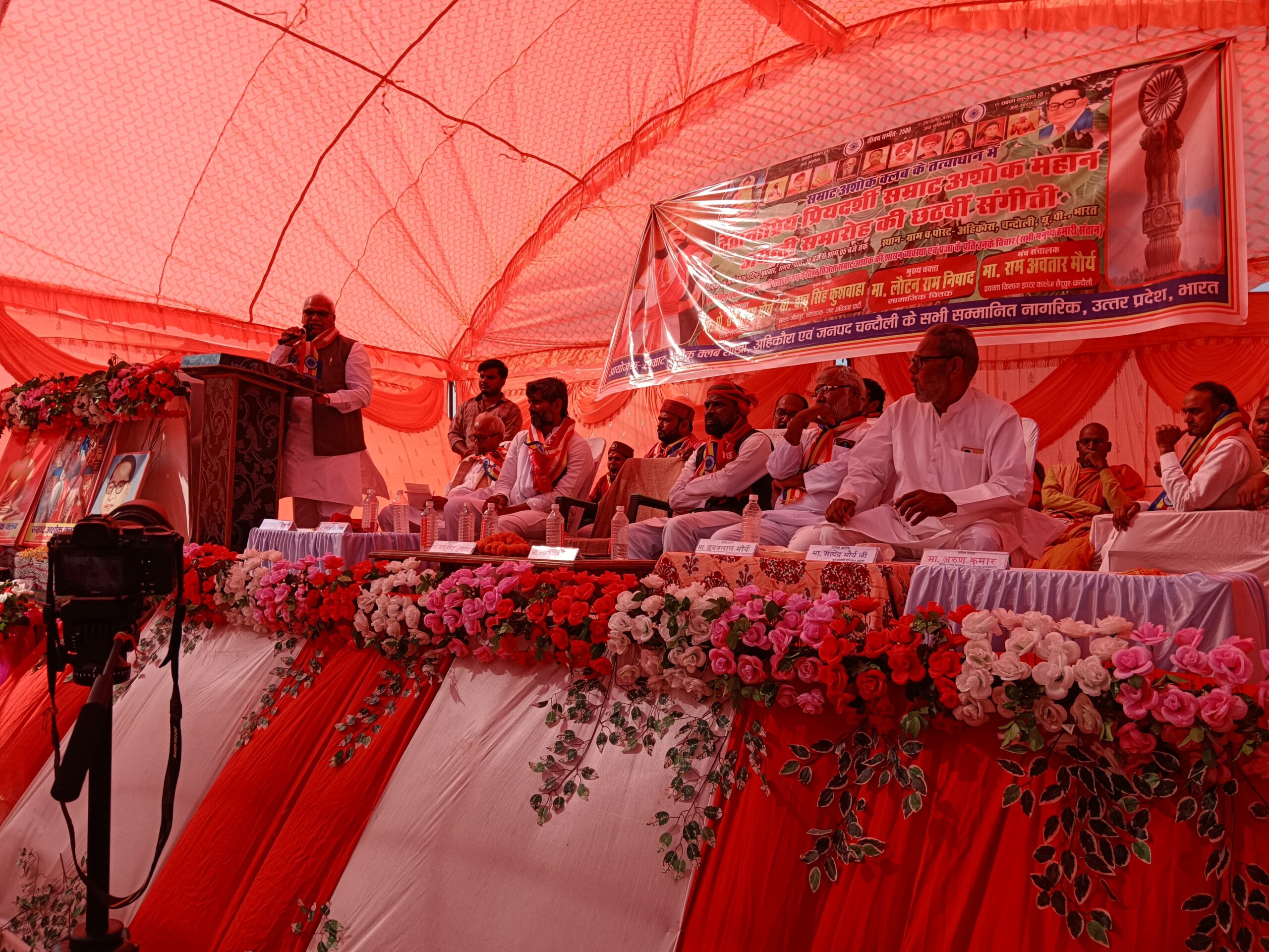 उन्होंने यह भी कहा कि सम्राट अशोक ने बौद्ध धम्म ग्रहण किया और कई वर्षों तक शासन किया।सपा के राष्ट्रीय प्रवक्ता मनोज सिंह काका ने टिप्पणी की कि जो लोग आजादी के आंदोलन में कोई सहयोग नहीं किए, वही आज राष्ट्रभक्त बन रहे हैं। मुख्य वक्ता लौटन राम निषाद ने आरोप लगाया कि प्रदेश की योगी सरकार पिछड़े और दलितों के हकों पर डाका डाल रही है और उनके अधिकारों को छीना जा रहा है।