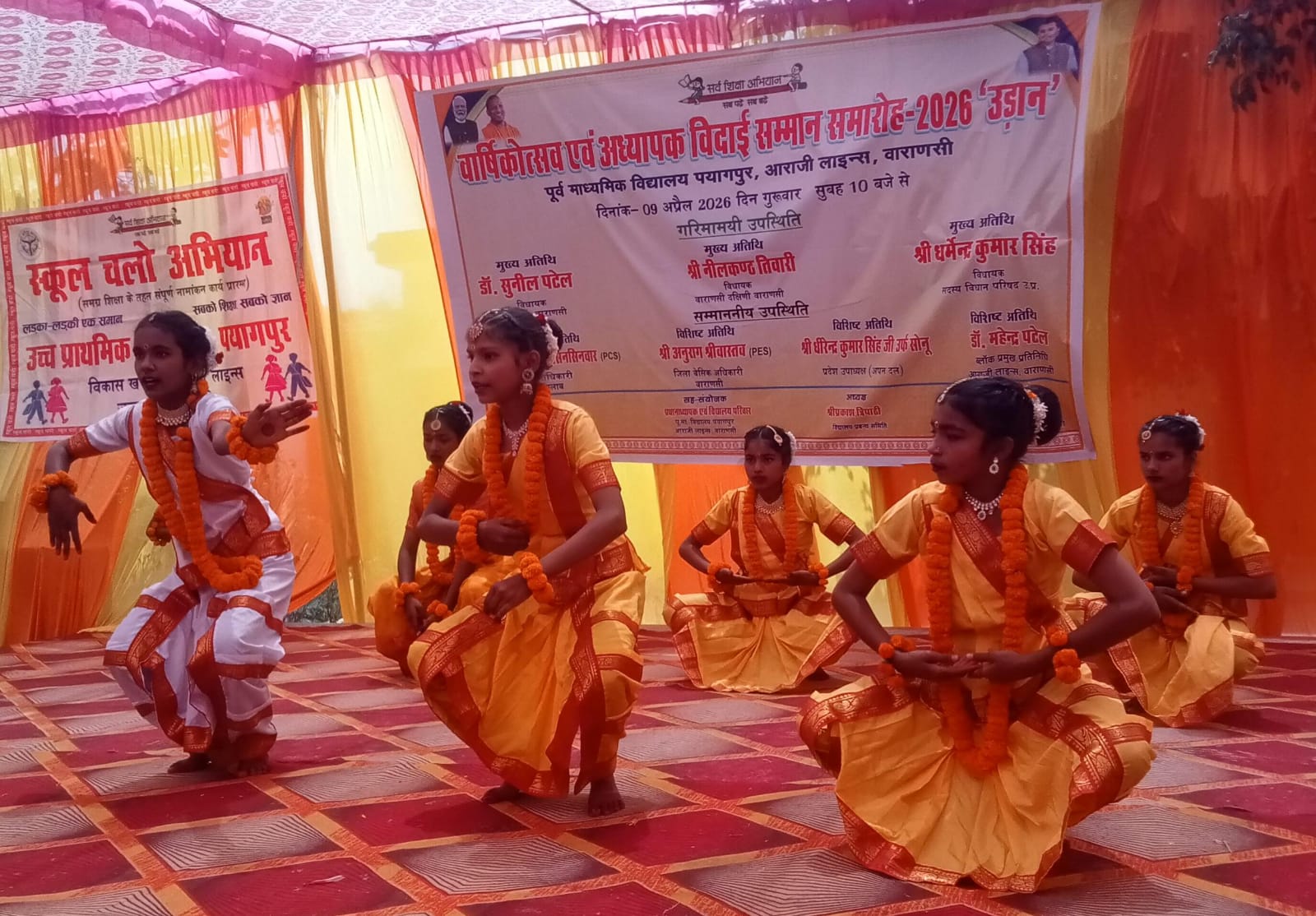 आराजी लाइन विकासखंड क्षेत्र के मातलदेई,पयागपुर स्थित पूर्व माध्यमिक विद्यालय के प्रांगण में गुरुवार को प्रधानाध्यापक सत्य प्रकाश सिंह की देखरेख में सेवानिवृत शिक्षक सम्मान समारोह एवं वार्षिकोत्सव 2026 ‘उड़ान’ कार्यक्रम का आयोजन किया गया। कार्यक्रम का शुभारंभ मुख्य अतिथि रोहनिया विधायक डॉक्टर सुनील पटेल व एमएलसी धर्मेंद्र राय तथा विशिष्ट अतिथि जिला बेसिक शिक्षा अधिकारी अनुराग श्रीवास्तव व खंड शिक्षा अधिकारी शशिकांत श्रीवास्तव व राम पूजन पटेल,पूर्व माध्यमिक शिक्षक संघ अध्यक्ष विनोद उपाध्याय,महामंत्री रविंद्र नाथ यादव तथा ब्लॉक प्रमुख प्रतिनिधि डॉ.महेंद्र सिंह पटेल ने संयुक्त रूप से मां सरस्वती के चित्र पर माल्यार्पण एवं दीप प्रज्वलन कर किया।