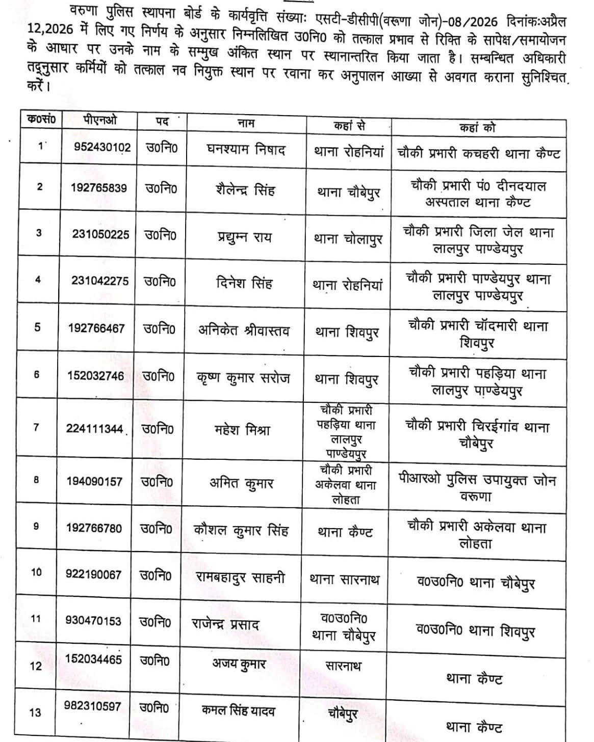 वाराणसी कमिश्नरेट के वरुणा जोन में पुलिस प्रशासन ने बड़ा प्रशासनिक फेरबदल करते हुए 13 उपनिरीक्षकों (SI) के तबादले किए हैं। यह आदेश वरुणा पुलिस स्थापना बोर्ड की बैठक में लिए गए निर्णय के आधार पर तत्काल प्रभाव से लागू किया गया है।