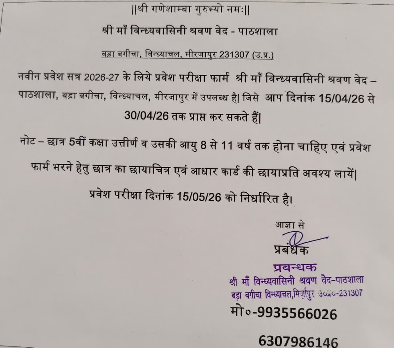 श्री माँ विंध्यवासिनी श्रवण वेद पाठशाला, बड़ा बगीचा, विंध्याचल, मीरजापुर में नवीन प्रवेश सत्र 2026-27 के लिए प्रवेश परीक्षा फॉर्म उपलब्ध करा दिए गए हैं। इच्छुक अभिभावक दिनांक 15 अप्रैल 2026 से 30 अप्रैल 2026 तक पाठशाला से प्रवेश फॉर्म प्राप्त कर सकते हैं। महत्वपूर्ण जानकारी:प्रवेश के लिए छात्र 5वीं कक्षा उत्तीर्ण होना चाहिए।