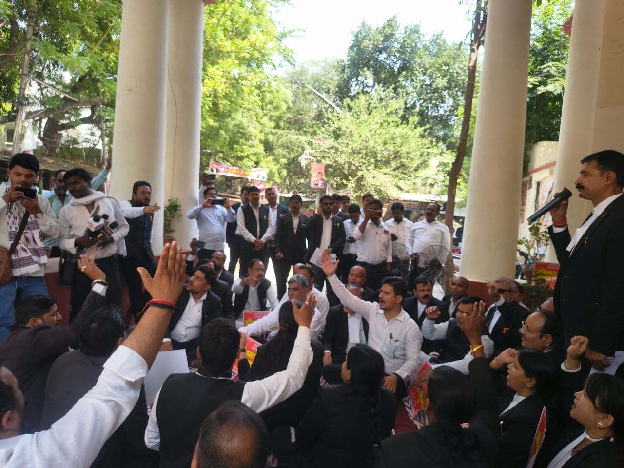 अधिवक्ता गण धरना प्रदर्शन करेंगे के धरना प्रदर्शन में सेंट्रल बार एसोसिएशन वाराणसी के अध्यक्ष प्रेम प्रकाश गौतम महामंत्री आशीष कुमार सिंह महामंत्री प्रत्याशी बनारस बार एसोसिएशन वाराणसी सन 2027 के राजेश प्रजापति एडवोकेट एवं शिव शंकर पटेल सुभाष प्रसाद पटेल अशोक कुमार प्रजापति इत्यादि अधिवक्ता बंधु उपस्थित रहे