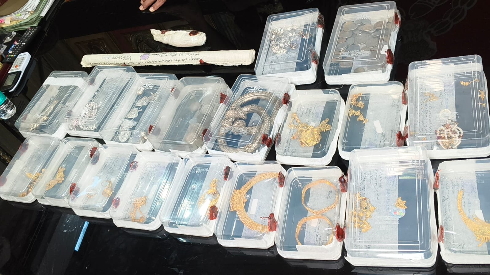 बरामदगी का विवरणः- 11 अदद टप्स पीली धातु जिसमे एक ट्पस में सफेद नग लगा हुआ, 04 अदद हार पीली धातु, 01 अदद मंगल सूत्र पीली धातु. 02 अदद कंगन पीली धातु, 01 अदद कान का बाला पीली धातु, 04 अदद अंगूठी पीली धातु 2 अंगुठीयो मे नग लगी हुयी 04 अदद झुमका पीली धातु, 03 अदद लाकेट पीली धातु, 02 अदद माथ बेदी पीली धातु 2 अदद कान की बाली पीली धातु 01 अदद मोती, पीली धातु की माला, 07 अदद कान का छोटा टप्स पीली धातु, 01 अदद नथ पीली धातु जिसमे सफेद नग लगा हुआ,