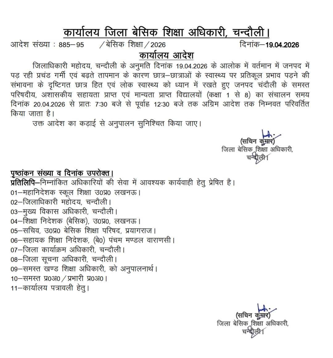 जिला बेसिक शिक्षा अधिकारी सचिन कुमार द्वारा जारी आदेश के अनुसार, अब जनपद के सभी परिषदीय, अशासकीय सहायता प्राप्त और मान्यता प्राप्त विद्यालय सुबह 7:30 बजे से दोपहर 12:30 बजे तक ही संचालित होंगे। यह आदेश 20 अप्रैल 2026 से अगले निर्देश तक प्रभावी रहेगा।