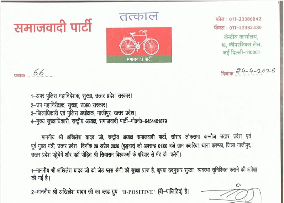 करंडा क्षेत्र स्थित कटारिया गांव में हुए पत्थरबाजी कांड और निशा विश्वकर्मा की मौत के बाद राजनीतिक माहौल लगातार गरमाता जा रहा है। इसी क्रम में समाजवादी पार्टी के राष्ट्रीय अध्यक्ष अखिलेश यादव 29 अप्रैल को गांव का दौरा करेंगे। उनके कार्यक्रम का आधिकारिक प्रोटोकॉल भी जारी कर दिया गया है, जिससे प्रशासनिक तैयारियां तेज हो गई हैं।