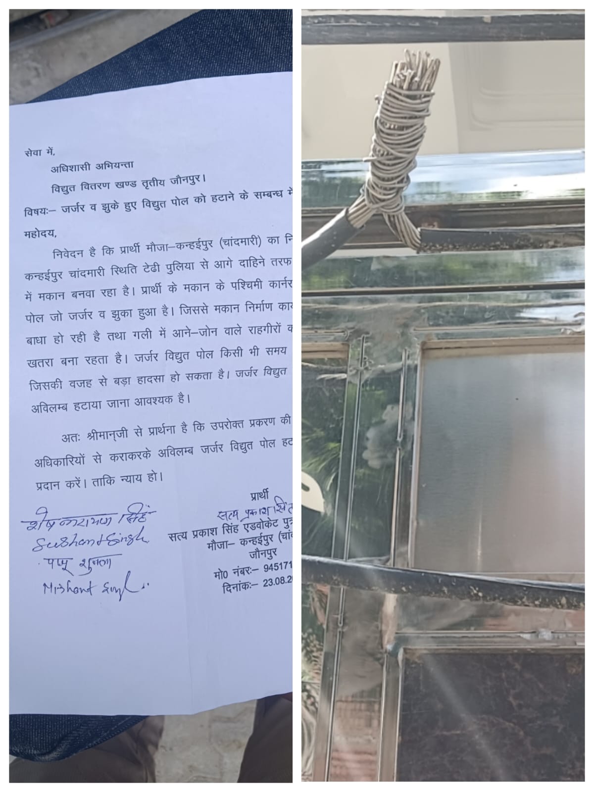 जौनपुर थाना लाइन बाजार स्थित चांदमारी कन्हईपुर कालोनी निवासी सत्यप्रकाश सिंह ने आज मिडिया से बातचीत करते हुए बताया कि आज कई महीनों से हमारे बिल्डिंग से सटा हुआ तार गुजरने से कभी भी बड़ा हादसा हो सकता है। और हमारे ही बिल्डिंग से सटा एक खम्भा भी लगा है। जो कभी भी गिर सकती है। जिसकी सूचना हमने लिखित बिजली विभाग के जे ई को सौंपा है।