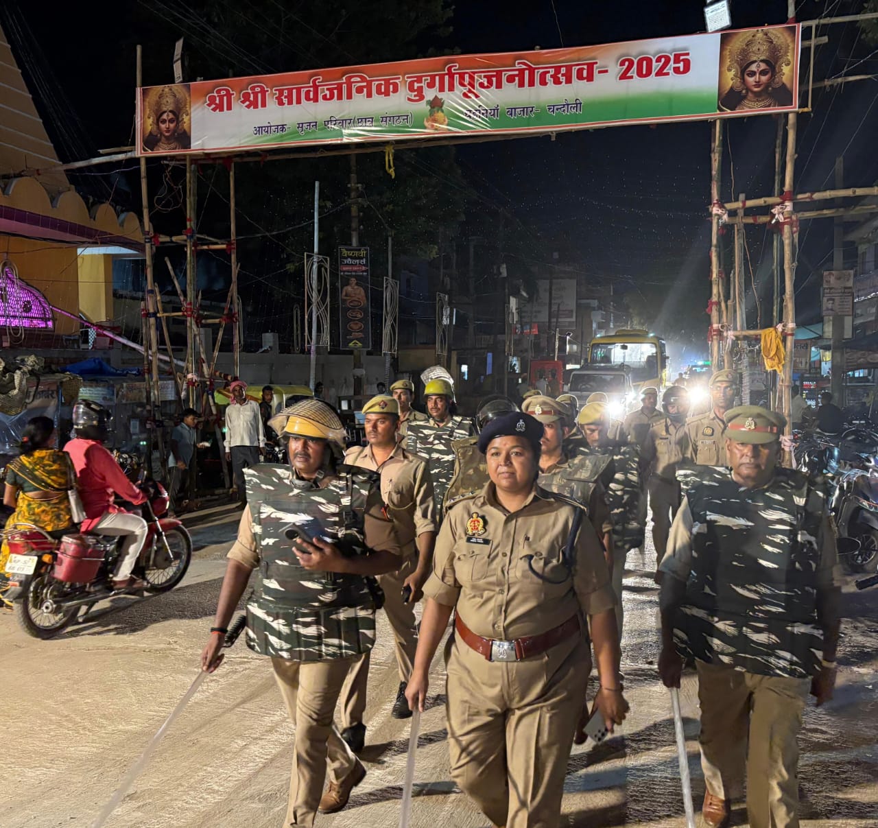 चहनियाँ/चंदौली शारदीय नवरात्रि व दशहरा पर्व के त्योहारो को शांतिपूर्ण सुरक्षित ढंग से संपन्न करने के लिए पुलिस प्रशासन पूरी तरह से सतर्क व मुस्तैद है। शनिवार की रात में सकलडीहा क्षेत्राधिकारी स्नेहा तिवारी बलुआ थानाध्यक्ष अतुल कुमार प्रजापति ने चहनिया कस्बा में भारी पुलिस बल के साथ पैदल फ्लैग मार्च पदयात्रा निकालकर लोगों को सुरक्षा का एहसास कराते हुए।सुरक्षा की भावना को मजबूत करते हुए आपसी सौहार्द और शांतिपूर्ण तरीके के साथ पर्व मनाने की अपील की। मिशन शक्ति पेज 5अभियान के तहत महिलाओं व किशोरियों आत्म सुरक्षा को लेकर जागरूक किया।