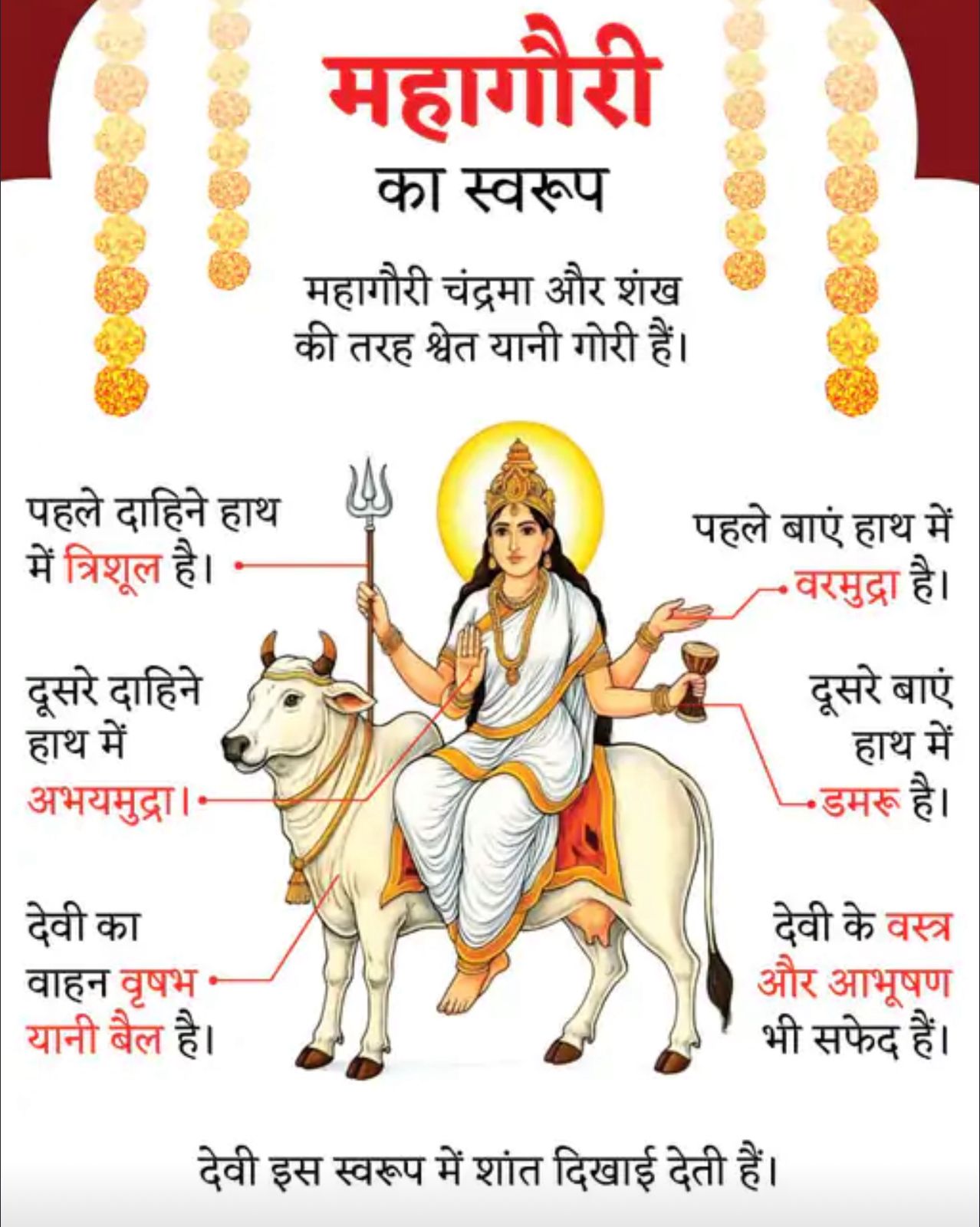 नवरात्रि की अष्टमी तिथि पर देवी महागौरी की पूजा करें। देवी का ये स्वरूप गौर वर्ण हैं यानी महागौरी बहुत गोरी हैं। महागौरी सफेद वस्त्र धारण करती हैं, इसलिए इनकी पूजा में सफेद कपड़े पहनने चाहिए। इनकी पूजा करने से भक्त के नकारात्मक विचार दूर होते हैं और मन को शांति मिलती है।