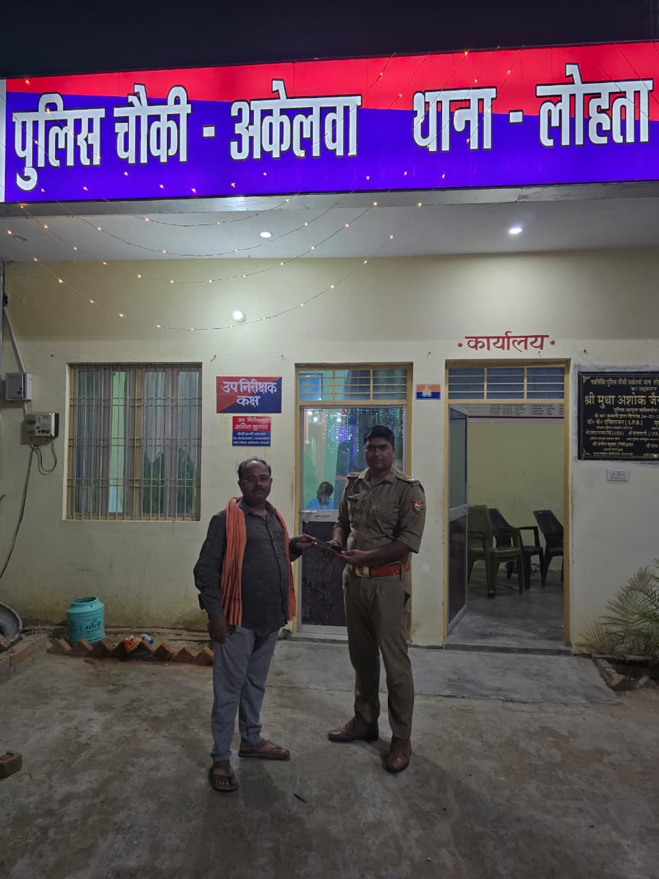 लोहता अकेलवा चौकी इंचार्ज अमित कुमार यादव द्वारा खोया हुआ मोबाइल एक घंटे के अंदर बरामद कर वापस किया गया एक व्यक्ति काशीनाथ नामक खोजवा चितईपुर निवासी अकेलवा क्षेत्र के मंगलपुर में किसी काम से आया हुआ था उसकी मोबाइल कहीं रास्ते में अकेलवा क्षेत्र में गिर गया था