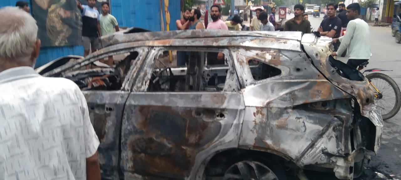 वाराणसी महमूरगंज तिराहे पर भीषण सड़क हादसा, कार में लगी आग
