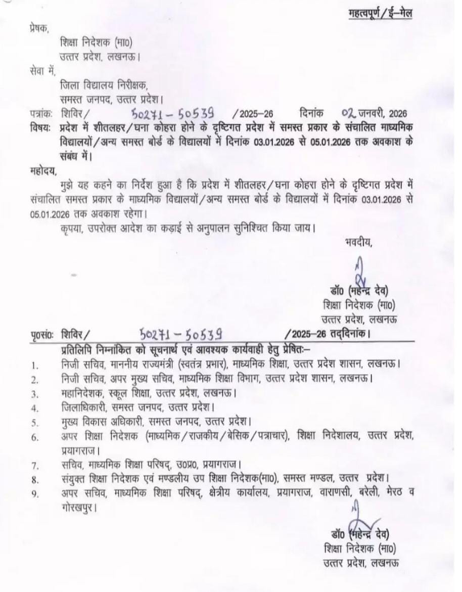 वाराणसी में इंटर तक के स्कूल बंद, ठंड और घने कोहरे के मद्देनजर शासन का निर्देश January 3, 2026 No Comments