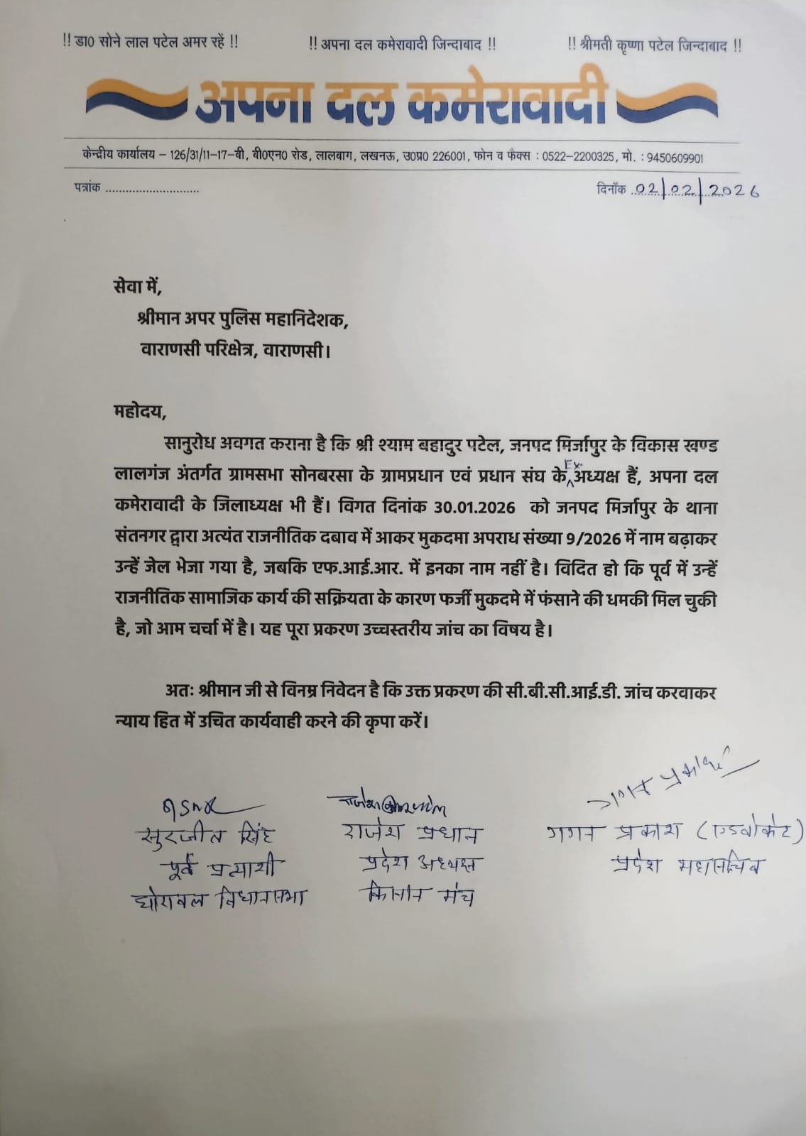 अपना दल (कमेरावादी) के जिलाध्यक्ष श्याम बहादुर पटेल की गिरफ्तारी: राजनीतिक दबाव का आरोप, एडीजी जोन वाराणसी को सौंपा गया पत्रक February 3, 2026 No Comments