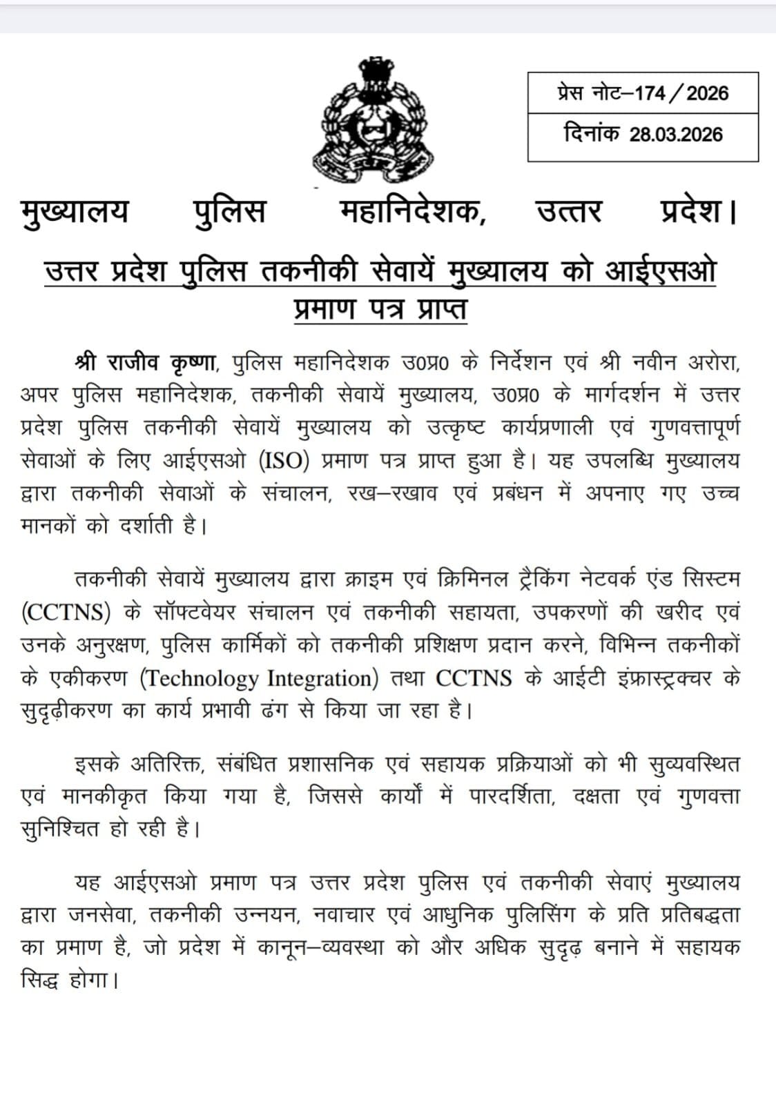 उत्तर प्रदेश पुलिस को मिला ISO प्रमाण पत्र, तकनीकी सेवाओं को मिली बड़ी उपलब्धि। March 29, 2026 No Comments